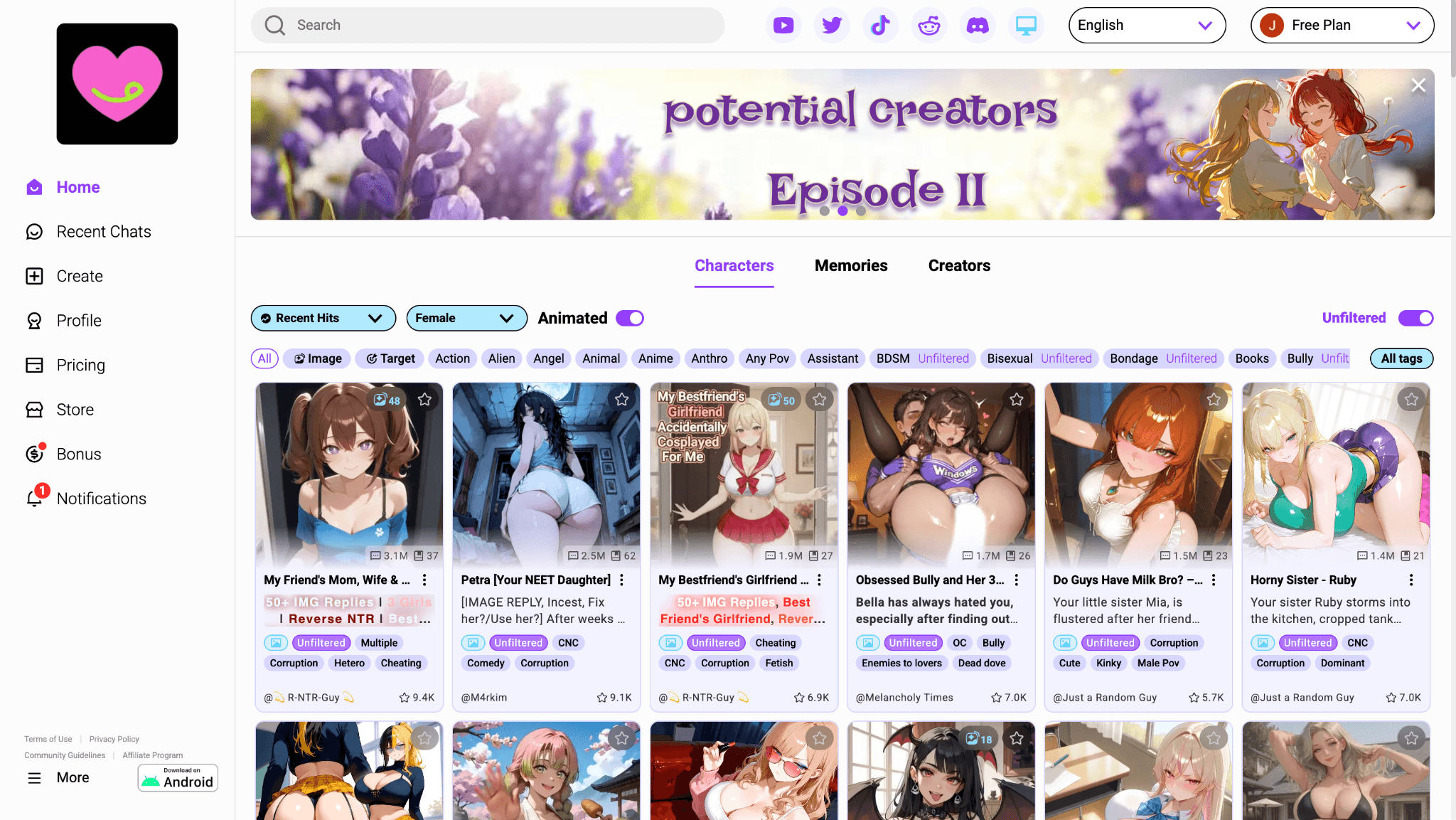 Sure, if you’re looking for an uncensored AI platform with an advanced chatbot, CrushOn AI is still among the top players. You can create your own character, give them a detailed backstory and personality, and dive into your own roleplay. The chat is fun, intuitive, has excellent memory, and best of all, it’s completely free in its basic form. It’s fully NSFW too, so you can let your imagination run wild.