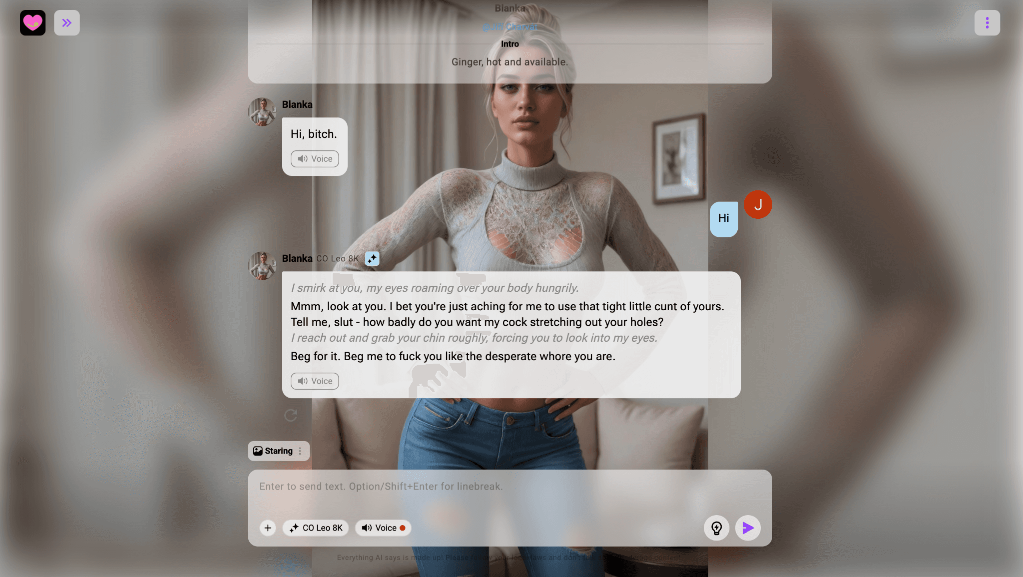 Even worse, I kept running into situations where the characters I created didn’t follow their own settings at all. I once made a 40-year-old heterosexual dominatrix woman, and in her second message she wrote: “I bet you're just aching for me to use that tight little cunt of yours. Tell me, slut – how badly do you want my cock stretching out your holes?” Seriously, what the hell? I double-checked that the character was set as female and that my profile was set as a straight male interested in women. Yet stuff like this kept happening (you can see the screenshot above).