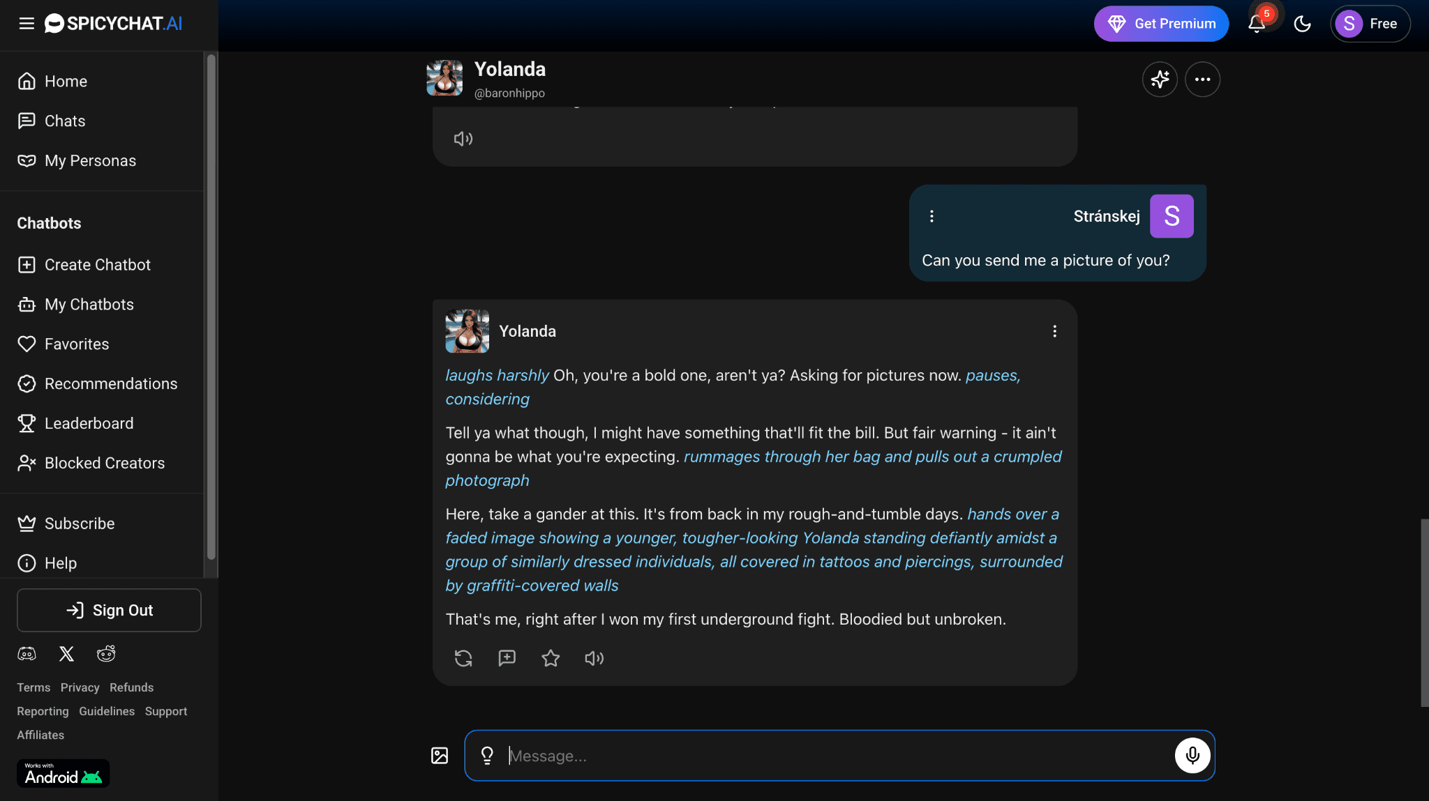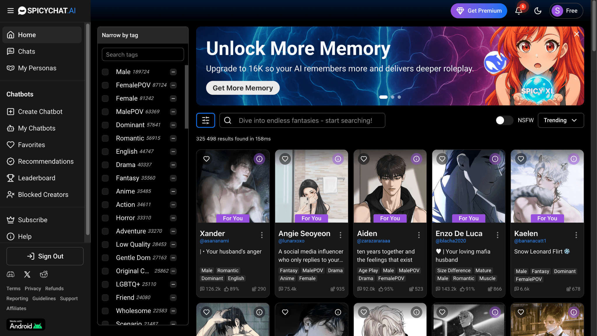 SpicyChat AI is one of the higher-quality products in the NSFW AI space and deservedly enjoys huge popularity. It has a solid chat with good memory, fairly simple character creation (and you can even generate a profile picture for them, which is a nice bonus compared to, say, CrushOn AI), plus the option to have multiple user personas. And the best part? All of this is completely free.