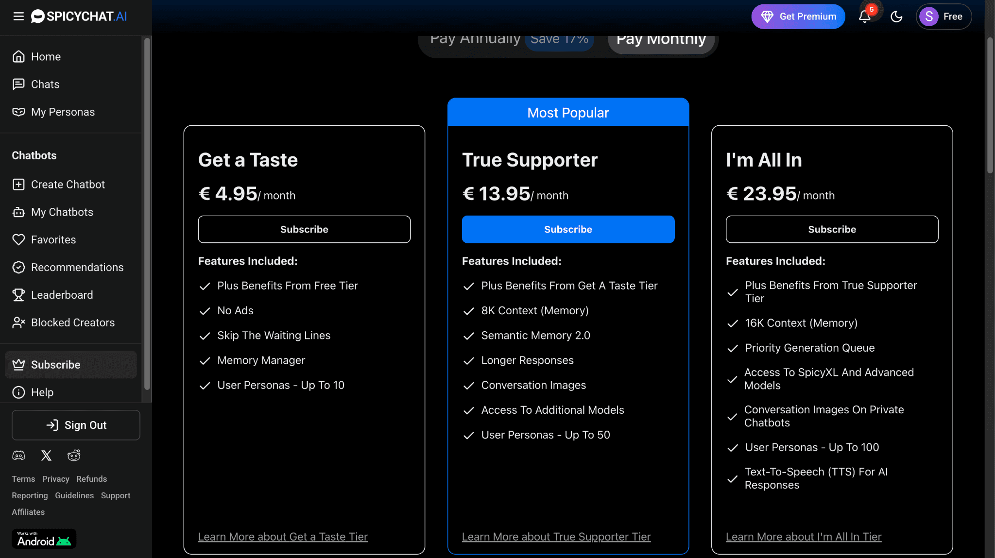 Another thing that really bothered me is that SpicyChat AI hides a ton of features behind a paywall. Paid tools include things like conversation images, text-to-speech for AI responses, or semantic memory. Sure, it’s normal for a platform to lock premium features behind a subscription, developers have to eat too. But what I absolutely hate about SpicyChat AI is that it offers three different subscription tiers (from €4.95 to €23.95 per month), and each tier unlocks new tools. So one plan isn’t enough to get everything. That just doesn’t feel fair to me.